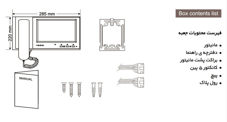 مانیتور سوزوکی SZ-725M هفت اینچ دارای ال سی دی با کیفیت بالا دارای دو ورودی پنل و قابلیت تنظیم صدای زنگ و نور و رنگ میباشد.